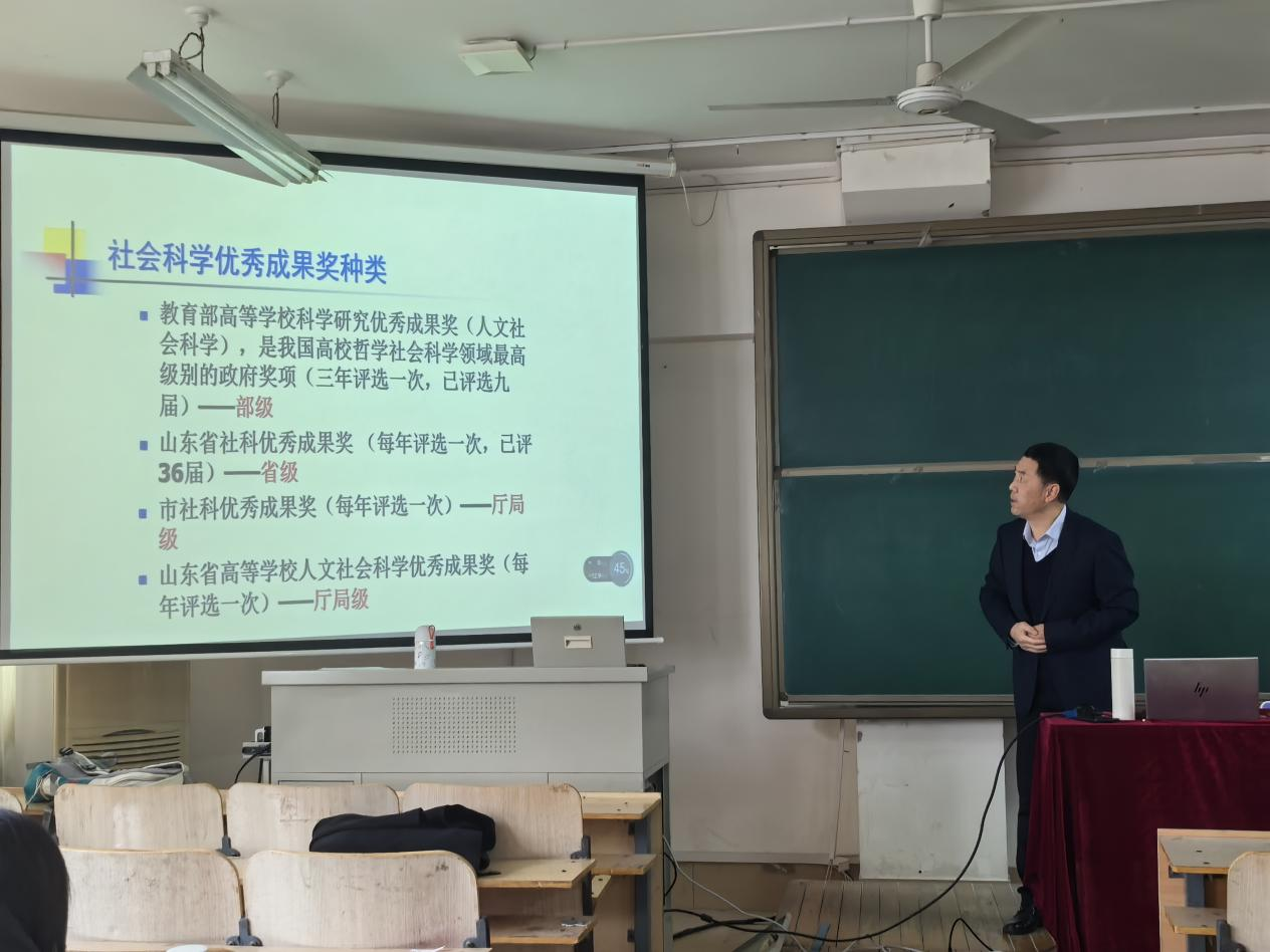 会议伊始,孙翠萍经理对张同全教授进行简要介绍,强调了其在社会科学研究领域的深厚造诣和丰富经验。随后,张同全教授围绕“社会科学优秀成果奖申报”的主题,阐述了自己对社科成果奖的认识,强调了其对于推动社会科学研究、提升学术水平的重要意义。接着,张同全教授介绍了社会科学优秀成果奖申报的关键信息,特别是山东省社会科学优秀成果奖的奖项设置和评选标准。在谈到参评成果范围时,他重点分析了近年来评选政策的变化,包括评选条件的调整、申报材料的准备等关键内容。同时,他还就评选程序、限额申报等重要环节进行了详细说明,为教师们在申报过程中可能遇到的问题提供了实用的指导和建议。讲座最后,张同全教授从“如何发表高水平论文”“如何提高研究成果的影响力”两个维度,分享了宝贵的学术心得和实践经验。