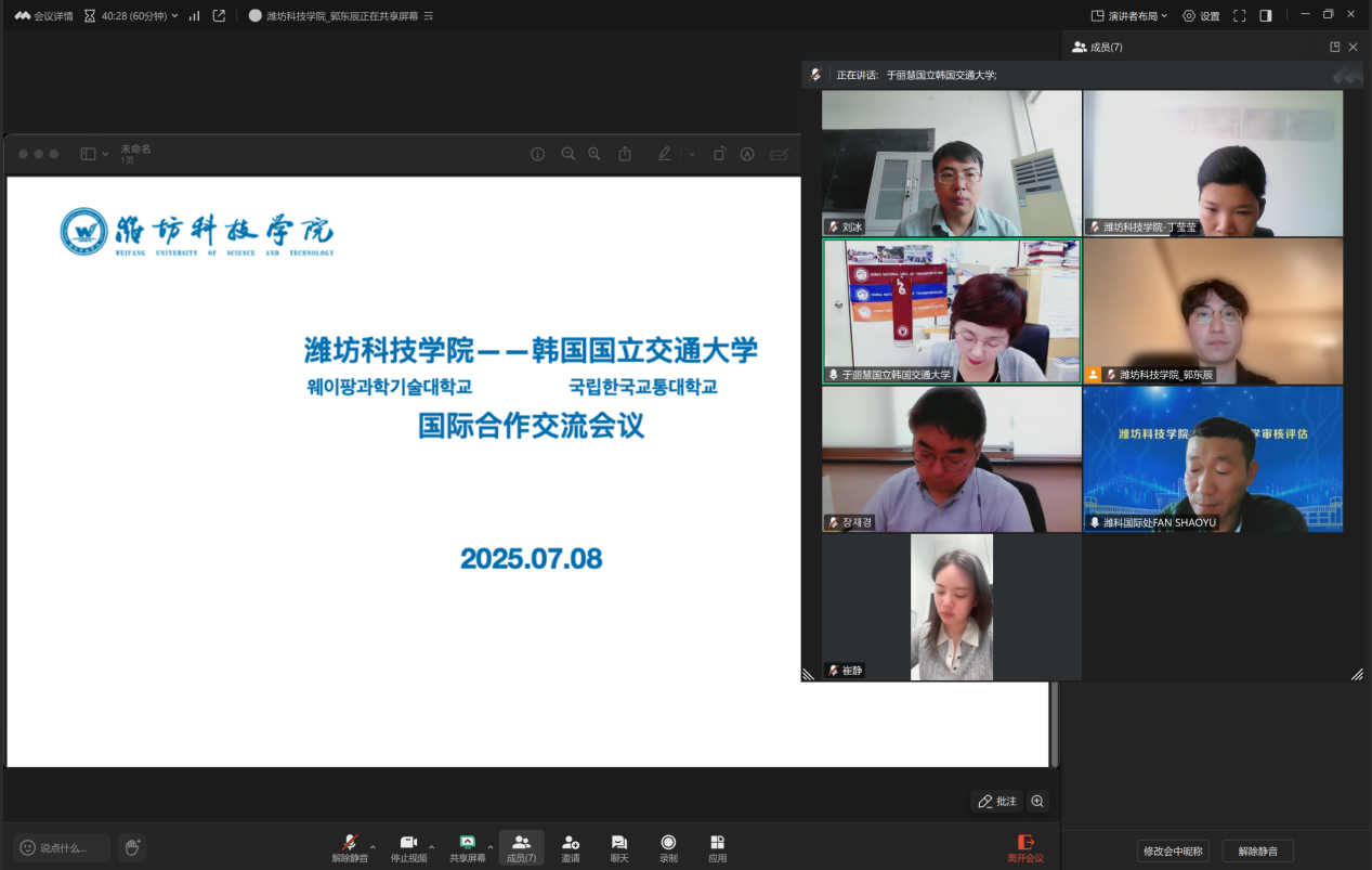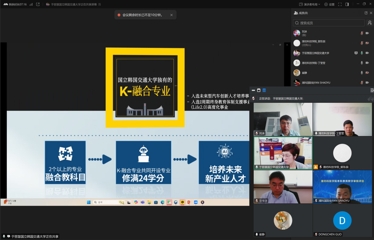 2025年7月8日上午,太阳成集团122ccvip与国立韩国交通大学国际交流部线上召开国际交流项目洽谈会。国立韩国交通大学国际交流部张宰炅科长、于丽慧主任,太阳成集团122ccvip国际交流处处长范绍玉,太阳成集团122ccvip经理丁莹莹、副经理刘冰等参加会议,会议由刘冰主持。