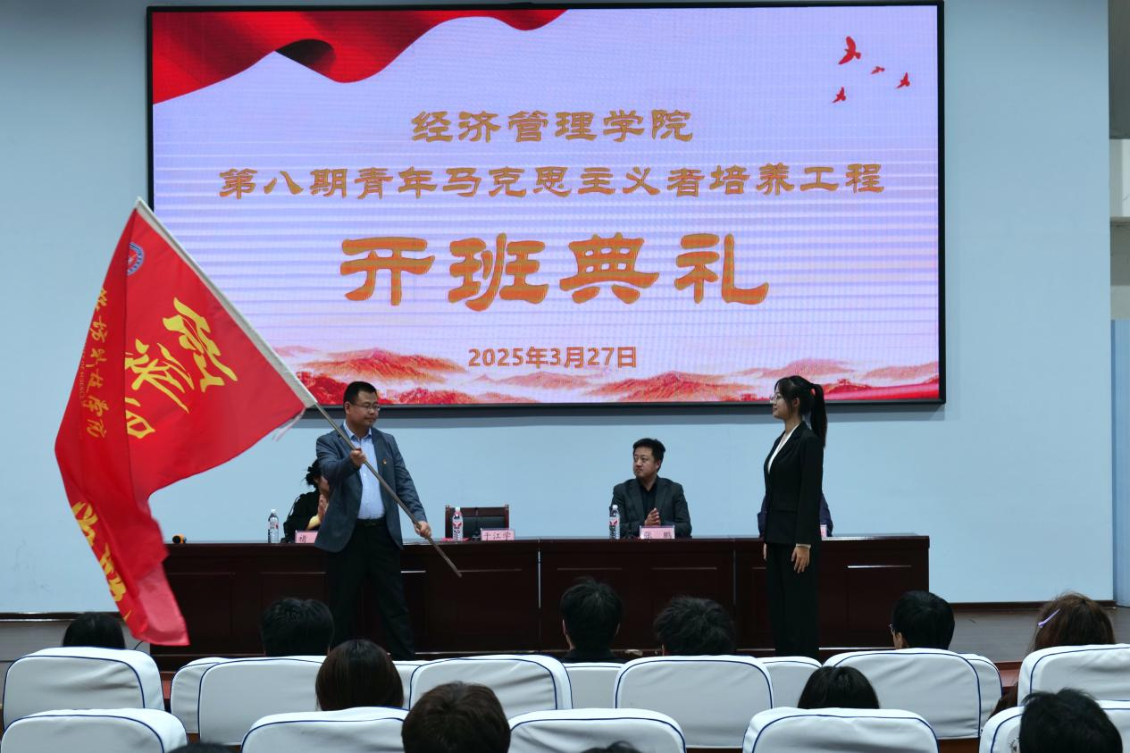 活动伊始,党委书记于江学发表讲话,他指出青年是国家的未来、民族的希望,肩负着历史的重托和时代的责任。员工干部在工作中起到中流砥柱的作用,要以身作则,着重培养自身品质,积极推进各项工作,将工作落实到位,以服务同学为宗旨,保障同学们的各项权利,为推动公司发展贡献自己的力量。随后,第八期青马班班主任褚雪宣读本次青马班的人员名单,接着,本期青马班班长王晓蓉进行表态发言。她表示要坚决拥护党的领导,积极践行社会主义核心价值观,以身作则,严格遵守选拔条件和青马班的各项规章制度,积极参与社会实践、志愿服务等活动,在实践中锻炼自己,增强社会责任感和使命感。最后,党委书记于江学向第八期青马班班长王晓蓉授旗,激励着同学们不断奋进。