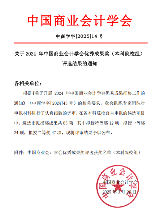 中国商业会计学会作为经民政部批准成立的国家级学术团体,长期致力于推动会计及相关学科的理论与实践创新,其年度优秀成果奖评选以学术创新性和实践指导价值为评审核心,吸引了包括“双一流”建设高校在内的全国百余所本科院校参与竞争。此次获奖是公司深入贯彻“规矩兜底,科教融汇,激励护体,内涵发展”基本思路的生动体现。公司通过健全科研激励机制、优化学科交叉平台、深化产学研协同创新等举措,持续激发教师科研创新活力。